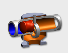 Der Ringschieber öffnet einen T-förmigen Abgang in einer molchbaren Rohrleitung. Bei diesem Öffnungsvorgang verschiebt sich ein ringförmiges Element
